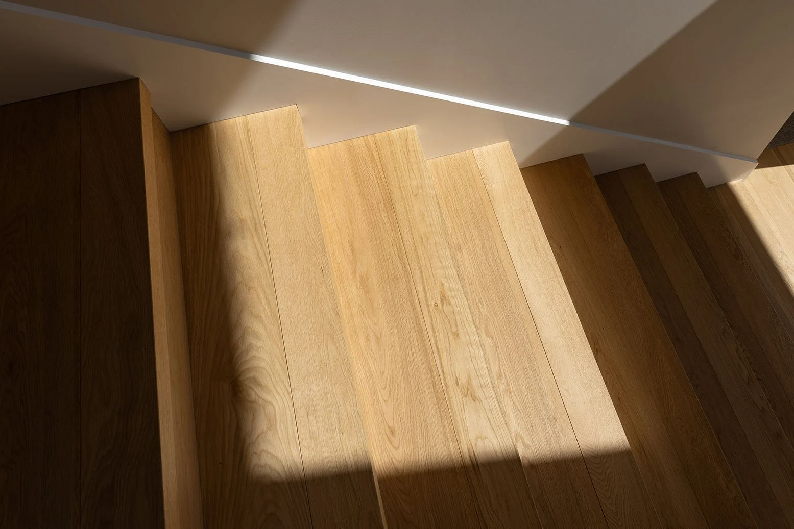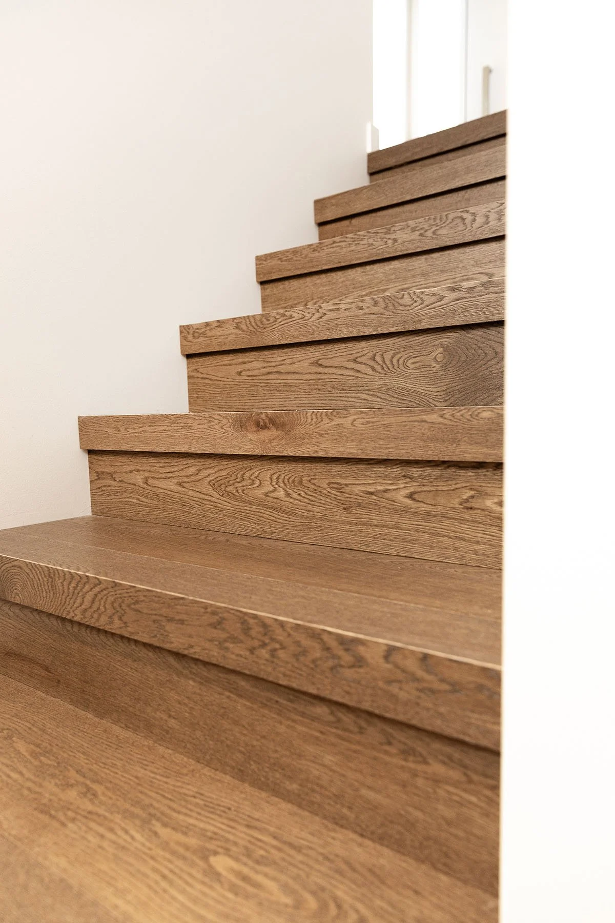 An alternative, and more expensive approach, is to form completely separate ‘boxes’ for each stair tread. This will certainly involve a joiner to create the boxes and have them installed and an engineer to size the structural tread substrate. Don’t let this put you off though, as you can tell from some of our photos, separate box treads create a fantastic aesthetic.